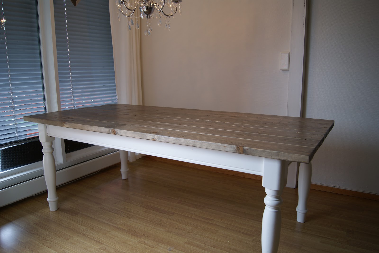 Alt du trenger, er bordbeina, en plate (her en Ikea hylleplate i tre), og beis. Borka (planker rett fram, limt bordplate). Benjamin (innrammet bordplate med skrå planker i midten). Bordplate beiset i Drivve hvitmalt understell. Beisen er en vanntynnbar oljebeis som påføres feltvis, 2-hele bord av gangen. Et egenprodusert bord sitter man gjerne lenge ved.