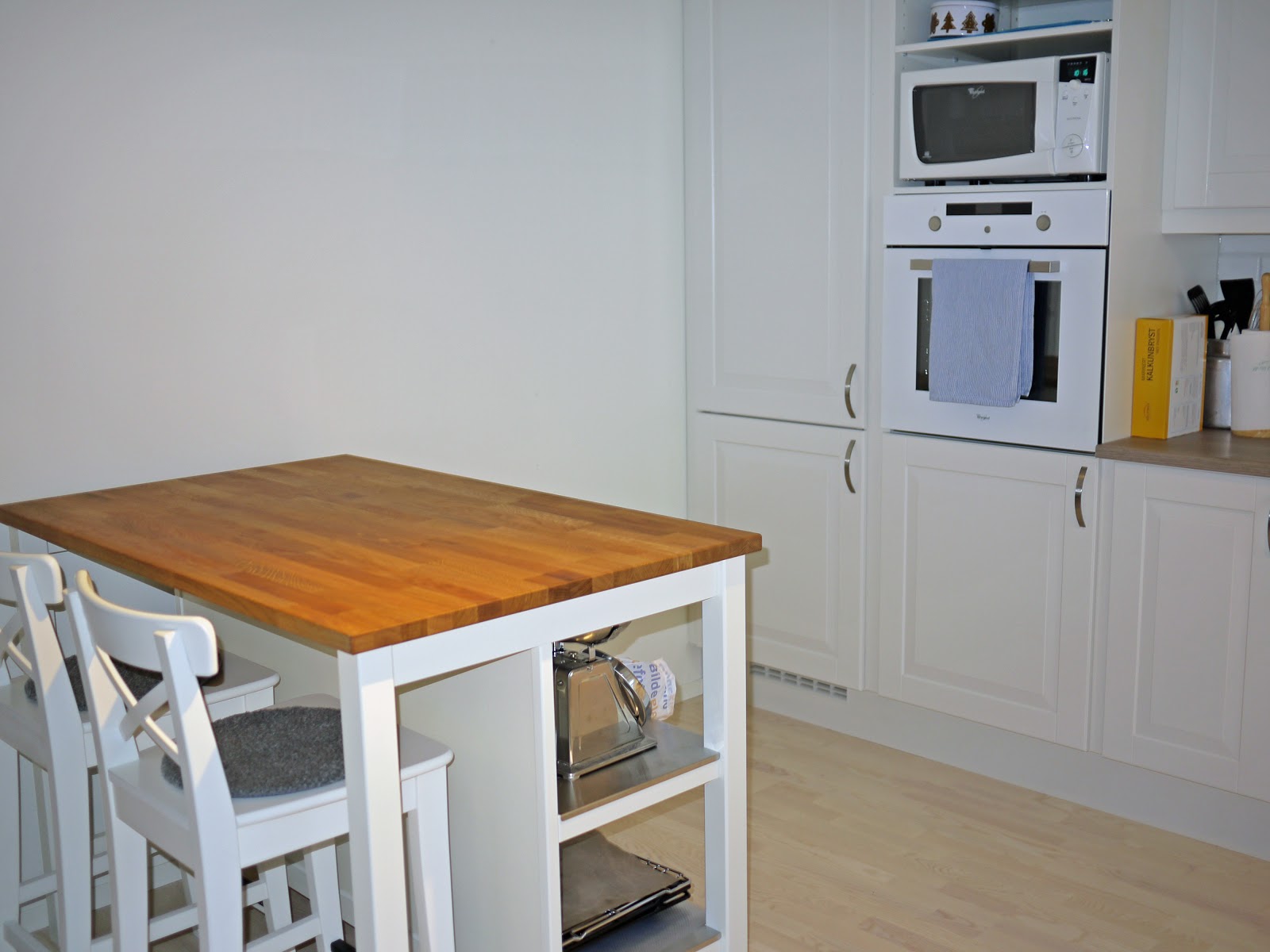 Riktignok har vi ikke ennå satt på dekksidene og satt i skuffer i skapene, men likevel. Skal jeg feste denne øya i gulvet, eller blir den tung nok av seg selv? Dersom det var mitt kjøkken, hadde jeg skrudd det fast.