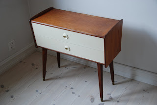 Se oppskriften på fornyelse av fire typisk loppefunn: Furukommode, telefonbord i teak, salongbord i teak og en 50-talls spisestuegruppe. Nå har jeg fornyet dette gamle teak nattbordet, som skal stå i samme stue.